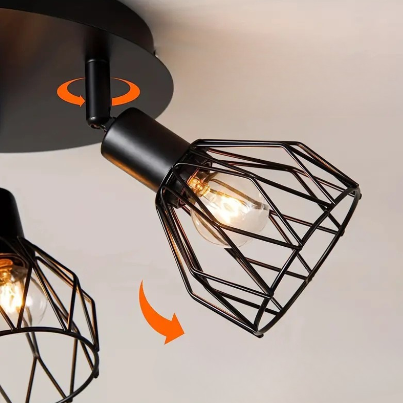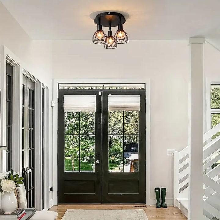 Industrial 3-Light Ceiling Fixture in Black Metal Cage Design